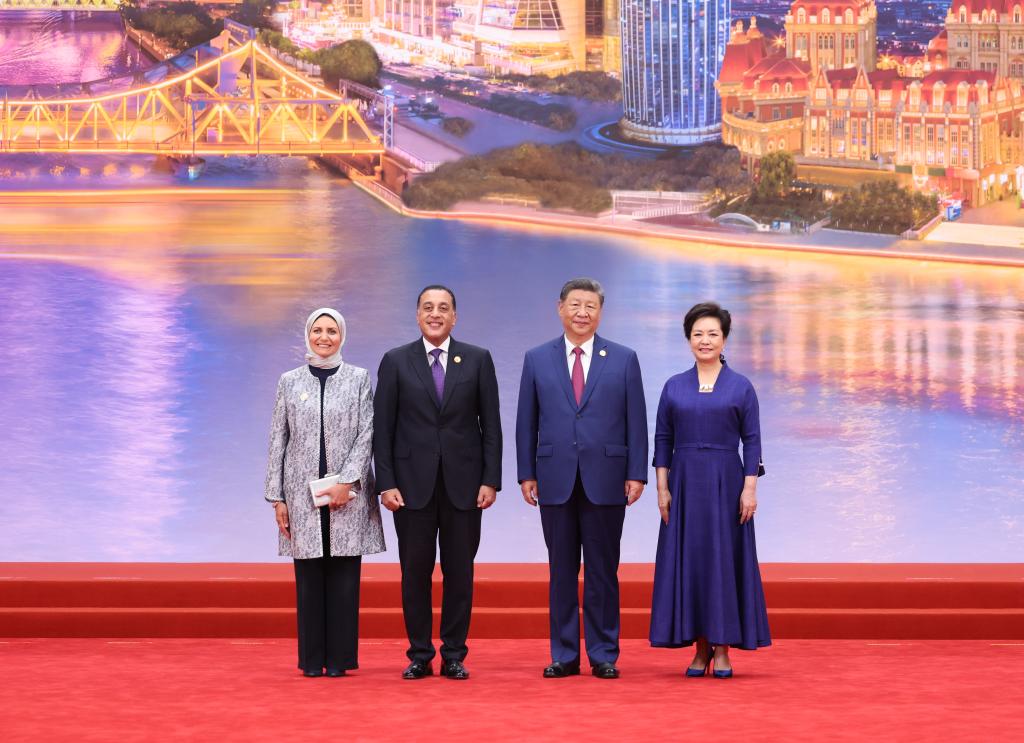 Chinese President Xi Jinping and his wife, Peng Liyuan, pose for a group photo with Prime Minister of Egypt Mostafa Madbouly and his wife at the Meijiang Convention and Exhibition Center in Tianjin, north China, Aug. 31, 2025. Xi and Peng on Sunday hosted a banquet in China's port city of Tianjin to welcome international guests who are here to attend the Shanghai Cooperation Organization (SCO) Summit 2025. (Xinhua/Ding Haitao)