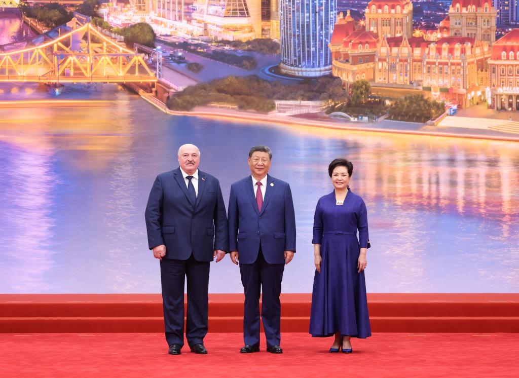 Chinese President Xi Jinping and his wife, Peng Liyuan, pose for a group photo with Belarusian President Alexander Lukashenko at the Meijiang Convention and Exhibition Center in Tianjin, north China, Aug. 31, 2025. Xi and Peng on Sunday hosted a banquet in China's port city of Tianjin to welcome international guests who are here to attend the Shanghai Cooperation Organization (SCO) Summit 2025. (Xinhua/Huang Jingwen)