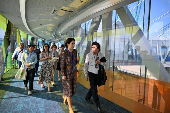 7月23日,嘉賓在天津港智慧碼頭參觀時交流。新華社記者 孫凡越 攝